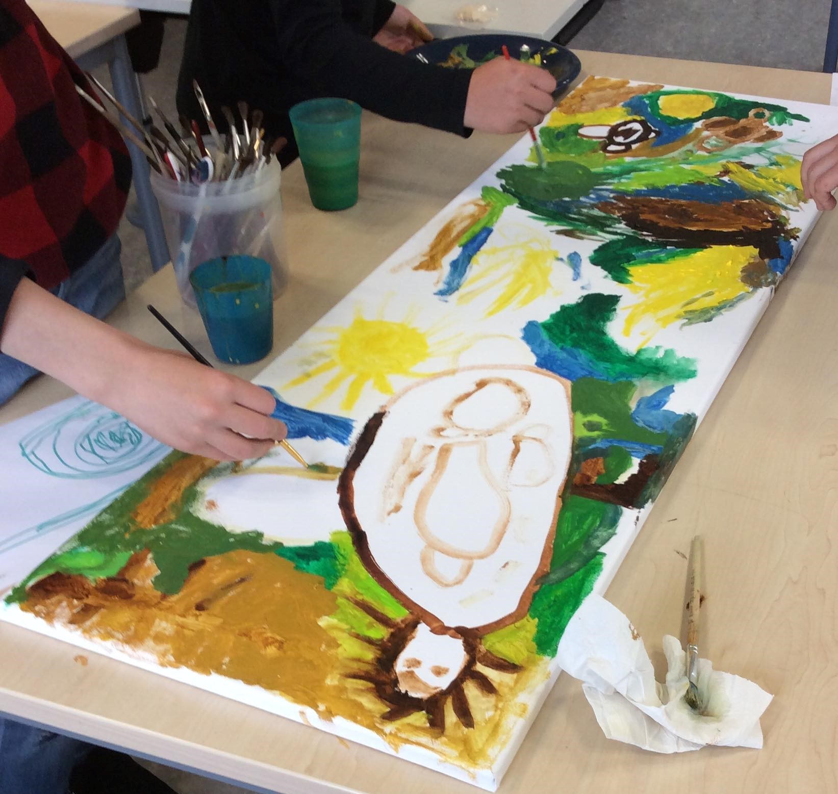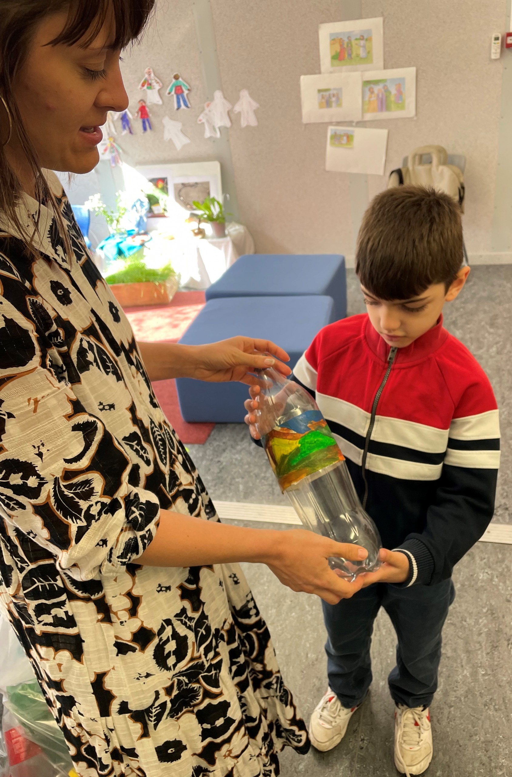 Die gesammelten Flaschen hat Nora mit ihren Primarschülern aus dem Behälter geholt und im Unterricht gesäubert. Die Flaschen wurden nun zur künstlerischen Flaschenpost: die Schülerinnen und Schüler bemalten über Wochen Leinwände im Unterricht, diese wurden dann um die Flaschen gewickelt. Dieser künstlerische Ausdruck ist die Nachricht an die Zukunft. Insgesamt haben die Kinder und Nora einige Quadratmeter an Leinwand bemalt.