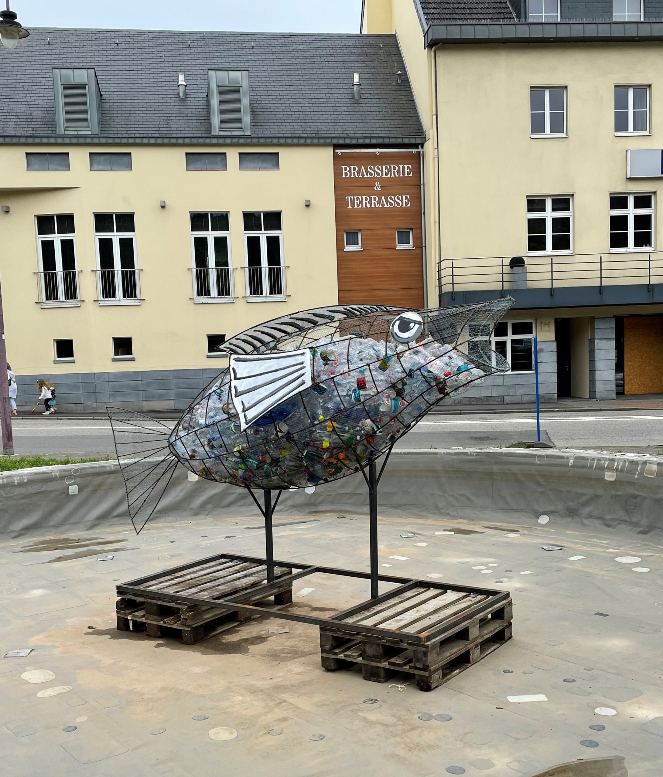 Nun steht unser Wal seit Juni 2022 im Brunnen des Themseparks der Unterstadt. Durch eine Anfrage an das Gemeindekollegium der Stadt Eupen, haben wir die Erlaubnis bekommen, das Kunstwerk bis auf Weiteres dort zu platzieren.