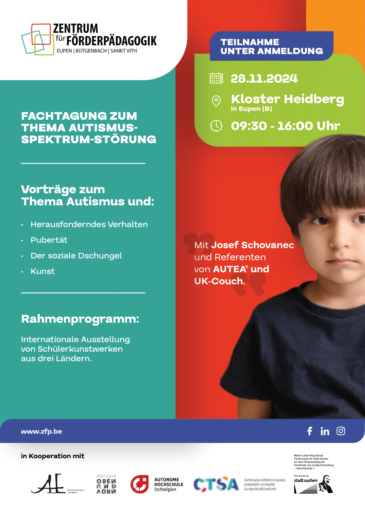 Im Rahmen unserer Projektpartnerschaft, dem Euregionalen-Autismus-Netzwerk (EAN), organisiert das Zentrum für Förderpädagogik in Kooperation mit der Autonomen Hochschule in Ostbelgien, der Martin-Luther-King-Schule in Aachen sowie dem CTSA aus Luxemburg eine Fachtagung zum Thema 'Autismus-Spektrum-Störung'.